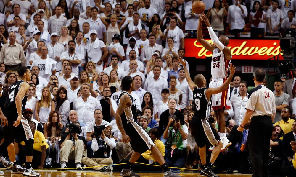 Although LeBron scored the go-ahead jumper with 1:43 left in OT, it was Ray Allen’s heroics from the fourth quarter that’s etched in our basketball memories forever. Down three points with less than 10 seconds in regulation, LeBron hoisted a potential game-tying triple from the corner. Chris Bosh secured the rebound over two Spurs defenders and shoveled a pass to Allen in the corner. He shuffled his feet behind the three-point line and drained one of the most clutch shots in NBA Finals history. BANG! (Thanks, Mike Breen)